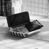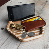 Solid American Cherry with Maple strips, finished with a durable, low-sheen varnish. Notched to hold your smart phone. Made in the USA out of sustainably-harvested hardwoods.